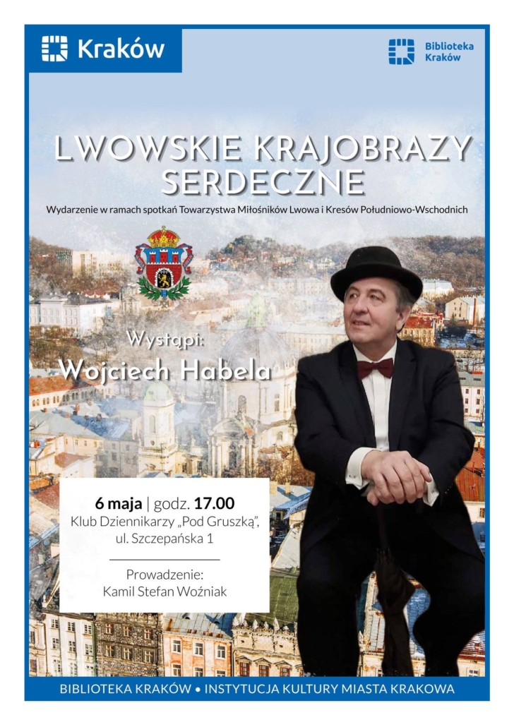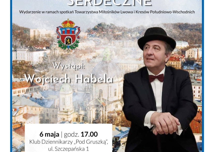 Wojciech Habela (absolwent wrocławskiej PWST) znany i lubiany aktor i piosenkarz, członek naszego krakowskiego Oddziału. Popularyzator lwowskiej kultury i bałaku zaprasza Państwa na recital oraz promocję swojej najnowszej płyty. Po koncercie będzie możliwość zakupu nowego albumu. Zapraszamy wszystkich do pięknej sali Fontany w Klubie Dziennikarzy „Pod Gruszką” we wtorek 6 maja o godzinie 17:00 (ul. Szczepańska 1, róg Rynku Głównego, Kraków).